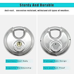 【Ultimate Security】- Stainless steel lock body and shackle with round Shielded design provide superior cut and pry resistance and minimizes shackle exposure. 【Heavy Duty and Weatherproof Lock】- These disc padlocks are made of heavy-duty stainless steel, which is anti-rust and corrosion resistant and can withstand all types of weather. 【Disc Lock Specifications】- The size of the lock body including the rubber sheath is 2.75*2.75*1 inch, 3/8 inch diameter shackle. It comes with 4 keys to avoid problems with broken or lost keys. 【Widely Use】- The disc lock is good for indoor and outdoor use. Good ideal for storage units, locker, garages, sheds, outdoor gates, warehouses, doors, Pods,trailers, mobile trucks etc. 【Professional After-sales Service】: If you have any questions during use, please feel free to tell us, we will give you a satisfactory solution.