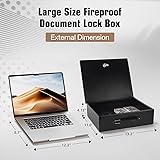 FIREPROOF SAFE BOX: Featuring a reinforced double-layer steel structure on all four sides, with fire-insulating material sandwiched in between, this fireproof document box delivers outstanding fire resistance. This smart, innovative design provides maximum peace of mind by safeguarding your most important belongings during unexpected fires. LARGE CAPACITY: Our fire proof safe for home documents has interior dimensions of 11.8" x 9.65" x 3.43", and fits A4 and letter-sized papers without folding, the fireproof lock box is thoughtfully desinged to offer secure and spacious storage for all your important papers. RELIABLE QUALITY: Crafted from durable cold-rolled steel and finished with a scratch-resistant powder coating, this lock box is built to last. The textured surface not only adds a touch of elegance but also ensures long-term resilience. KEY LOCK AND HANDLE: This fireproof safe features a sturdy plastic carrying handle, making it easy to carry and move whenever needed. The money lock box also comes with a simple and reliable key lock system—just turn the key counterclockwise to unlock. We kindly remind you to keep your keys in a safe place, as they are essential for accessing your valuables. MULTIPURPOSE USE: Our fire safe document box works well at home, in the office, in cars, or in storage cabinet And it makes a practical gift for family, friends, or employees to protect documents, cards, passports, cash, and Gun Safety boxs.