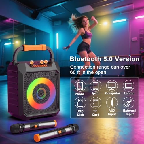 Karaoke Machine for Adults Karaoke Speaker with PA System,30W Portable Karaoke Machine with 2 Wireless Microphones,LED Lights Bluetooth Speaker for Singing,Supports TF/SD/USB, AUX in, FM,REC for Party