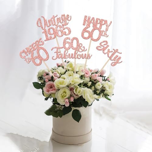 15 PCS Rose Gold 60th Birthday Centerpiece Sticks Double Sided Glitter Sixty Happy 60th Vintage 1965 Table Flower Centerpieces Sticks Cheers to 60 Fabulous Floral Decorations for 60th Birthday Party Centerpieces Supplies Perfect for happy 60th bithday theme party, vintage 1965 theme party,60th anniversary theme party,cheers to 60 years theme party centerpieces sticks floral decorations supplies. Pack of 15 pcs,3 pcs of each design. The size is 4.4*10.2 inch / 4.9*10.2 inch / 4*10.2 inch / 4.6*9.5 inch / 4.2*10.2 inch ( with stick ) Made of high quality double-sided glitter paper card stock,thick and sturdy. These centerpiece sticks are double-sided glitter, and they are intended for decoration only, please do not put them in oven or microwave. If the item you received has any defects, please contact us.we will deal with it within 24 hours.