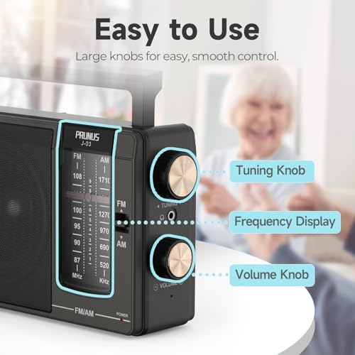 PRUNUS J-03 AM FM Radio Portable Plug in Wall or AA Battery Operated for Home/Outdoor, Large Speaker Excellent Sound, Excellent Reception 19.5 ant, Large Tuning Knobs for Easy to Use,Gifts for Seniors