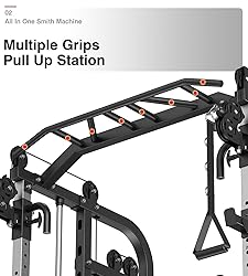 All-In-One Home Gym Station: Combines a Solid Smith Machine, a Power rack with safety arms, a Dual Cable Crossover System, and a Multi-Grip Pull-Up Station into a single, space-saving unit for comprehensive full-body workouts. Heavy-Duty Dual Weight Stacks: Equipped with two massive weight stacks, this machine delivers substantial, smooth resistance for exercises like lat pulldowns, rows, and cable crosses, eliminating the need for walking around to add weight plates. Professional Cable Crossover Design: Features a true dual independent cable system with high-quality pulleys and selectorized weight stacks, allowing for effective isolation exercises and versatile movement patterns that mimic commercial gym equipment. Safe, Clean & Sturdy Construction: The weight stacks are encased in durable steel covers, creating a neat and tidy appearance while enhancing safety by keeping cables and weights securely contained, unlike exposed plate-loaded designs. Commercial-Grade Build & Smooth Motion: Power rack is engineered with solid Smith machine poles and smooth linear bearings for stable, secure lifts, while the sturdy 2"x2" steel frame ensures safety and durability during use.