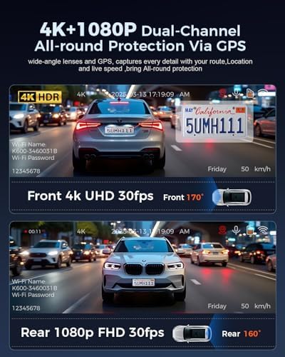 Cámara de Visión Frontal y Trasera Dash K600 4k, Pantalla IPS de 3.59", Cámara Dash con GPS Integrado 5G WiFi para Coches con Aplicación, Tarjeta SD Gratuita de 64G UHD 2160P, Visión Nocturna, Ángulo de 170°, HDR, Modo de Estacionamiento de 24H