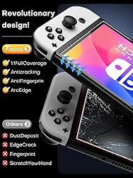 【👑Revolutionary Innovative Auto Installation】It features innovative automatic positioning, dust removal, and adsorption technology, making the installation a breeze within seconds. Simply align the frame on your Switch OLED, press and pull. With a success rate as high as 99.99%. 【🥇1:1 Full-Screen Coverage Design】Customized specifically for the Switch OLED 7", it features a specially designed 1:1 3D curved black edge that perfectly wraps around every curve of the screen. This design ensures a perfect fit with the phone's screen, leaving no corners uncovered and preventing dust and scratches from invading, while also being compatible with protective cases. 【💎Military-Grade Drop Protection】Proudly boasting the most advanced triple ion exchange technology, this Switch OLED screen protector has a hardness level far exceeding 9H. This ensures that your Phone is fearless against any drops or impacts, providing the highest level of screen protection in any environment. 【🥽HD Transparent Eye Protection】Made of optical-grade high-transparency material that faithfully reproduces the best visual feast brought by the Switch OLED screen. Additionally, professional blue light filtering technology is incorporated to create a more relaxed and comfortable viewing experience. 【🤲Responsive Touch with No Fingerprints】The surface of the protector is smooth and consistent, providing a touch experience as smooth as the bare screen. Thanks to the special fingerprint-resistant X-Silk coating technology, it effectively prevents fingerprints from sweat and oil, keeping your Switch OLED screen clean and new. 【👩⚖️Lifetime Warranty & Professional Support】Customer satisfaction is TOCOL's service tenet! This product includes 1 Switch OLED screen protector, a dust-free installation tool, and a cleaning kit. If you have any questions during use, please feel free to contact us. Rest assured, we will provide you with a satisfactory solution.