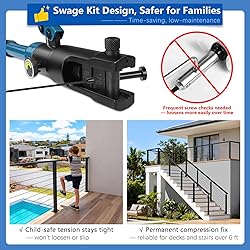 All-In-One Package, Easier DIY: (Note: Only Need To Buy A Crimping Tool Separately, search "1/8 cable crimper tool" to pick))The wire railing post kit includes all parts for convenient, cost-effective installation on a 180° wood or concrete floor. Simply measure your site, select the style and size based on your project. Max cable run is 20 ft; for longer runs (e.g., 40 ft = 20 ft + 20 ft), buy Invisible Terminal (B0FCYG4FRY) for the 6th post to connect sections, reducing total posts to 11 Rust-Resistant Stainless Steel, Long-Lasting Beauty: Heavy-duty cable railing posts and handrails are made from 1.35 mm-thick T304 stainless steel with a matte black powder-coated finish; 1/8" 7×7 wire rope and hardware are corrosion-resistant T316 stainless steel. Cable grommets protect wires from wear. Rust-resistant for porches, decks, indoors, and outdoors, ensuring long-lasting beauty (Need posts for coastal areas, search for Zylorix SS316 cable railing post) Swage-Style Tensioners, Safer & Low-Maintenance: We prioritize your safety! Our 42" complete cable railing kit features crimping tensioners for a safer installation on residential decks or stairs over 6 ft from the landing—especially for families with children, as they prevent detachment or stepping out of the wire. You only need to buy an additional 1/8" hydraulic crimping tool to crimp the tensioners, making tightening quick and low-maintenance compared to swageless fittings Code-Compliant System Kit, Reliable Safety: Each 41"×2"×2" level-drilled cable railing post includes 12 holes spaced 3-1/8" apart. The 2.36"-wide, 1.35 mm-thick handrail supports 200+ lbs. The 1/8" 7×7 cable is tested to 220 lbs. Meets 4" sphere building code and supports up to 4 ft post spacing, providing safe, reliable, and long-lasting performance for residential and commercial decks, porches, patios, etc Modern Black Style & Easy Installation: An all-black deck railing kit exudes modern luxury and elegance while serving as a visual cue that promotes safety, especially on the decks and terraces of mountain cabins. The undrilled black handrail can be cut to your desired length. Each package includes the cable railing posts, handrails, wire ropes, all necessary accessories and clear installation instructions.(Attenion: Always wear safety goggles or a face shield when using your drill or saw) Why Choose Us: Zylorix offers comprehensive, all-in-one 36" and 42" cable railing post kits with quality stainless steel hardware—providing affordable, full-system solutions that ensure unobstructed views and easy installation for homeowners and contractors. Our goal is to make home renovation simple and affordable. If you need customized solutions, pls reach out to us for a custom design. Explore our store to find the right fit and enjoy stunning views from your decks and balconies