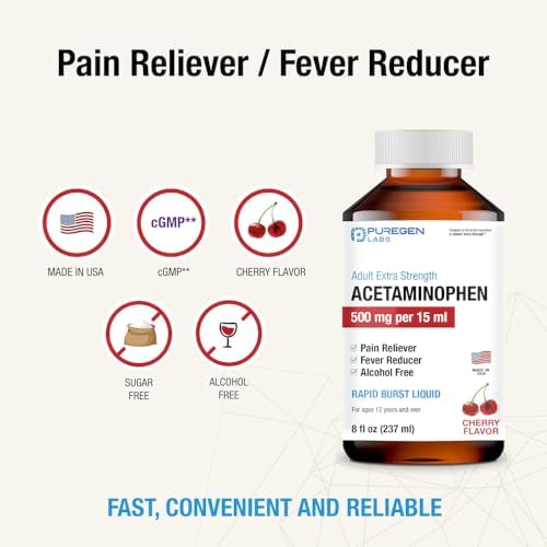 Puregen Labs Adult Extra Strength Acetaminophen Liquid 500mg/15ml - 8 fl oz Rapid Burst Pain Reliever/Fever Reducer, Cherry Flavor | Muscle & Joint Pain Relief | Arthritis Pain Relief