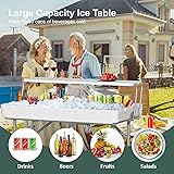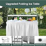【Sturdy and Stable Construction】The tabletop of the cooler table is made of high density HDPE, which is cold-resistant, heat-resistant and corrosion 【Efficient Drainage System】This ice table boasts a central drain outlet complemented by a convenient drain hose, facilitating quick and efficient drainage of melted ice water. Designed for both indoor and outdoor use, simply removing the drain cover allows for easy cleanup directly from the tabletop 【Upgrade Two-Tier Picnic Table with Detachable Table Skirt】We upgrade the outdoor cooler table to two-tier, and offer an extra bracket, which provides extra storage space for food and cups. Also comes with a white skirt which adds elegance when displaying some drinks and fruits at an event. The matching skirt is removable and washable 【Conveniently Foldable Design】This camping table is designed for easy portability and storage. The 4 legs of this ice cooler folding table can be folded under the tabletop, which makes it easy for you to transport and convenient to store it, greatly helping you to save your storage space 【Perfect for Various Occasions】The size of the portable cooler table is 39.4" x 22" x 39.4", perfect for various events such as weddings, parties, picnics, tailgates, fishing and family gatherings. It can be used to chill wine, beverages, fruits, food