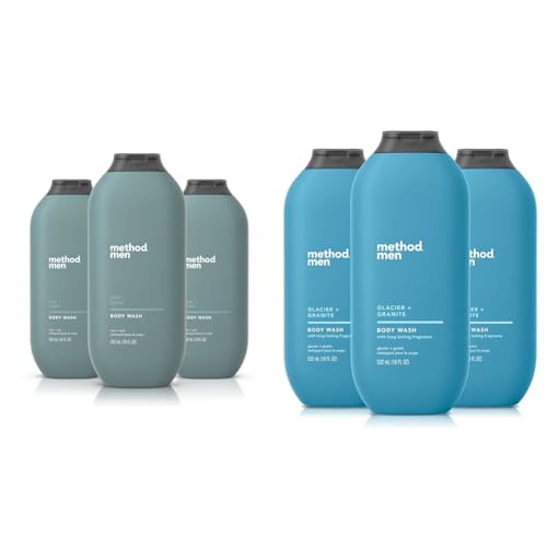 - Contains (3) 18 oz bottles of Method men's body wash in Sea + Surf and Glacier + Granite scents.