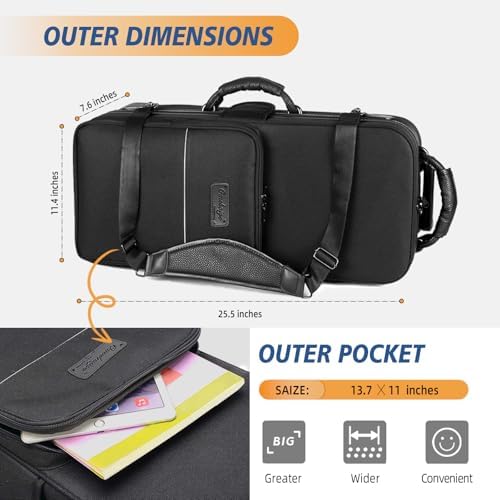 - Comfort and Durability: The thick padded handle and ergonomic shoulder straps of alto saxophone backpack provide exceptional comfort and durability. The X-shaped reinforcement design prevents the straps from detaching under heavy loads. The widened front pocket solves the issue of insufficient space for sheet music storage.