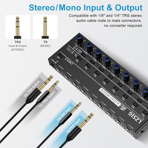 LZSIG Audio Mixer, Stereo Line Mixer for Sub-Mixing, Ultra Low-Noise, 8-Channel, Dynamic Microphone Independent Control, 1/4" & 1/8" TRS Output and Input, for Guitars,Bass,Keyboards