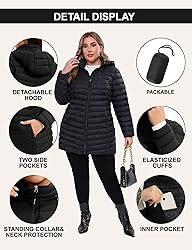 Plus Size:Stay cozy and stylish this winter with our plus-size women's jackets. Available in sizes 1X to 6X, these tailored designs effortlessly flatter your figure Warmth: Stay warm and stylish with our women's puffer jackets. Designed to keep you comfortable on crisp autumn evenings, and mild winter weather, these jackets offer cozy warmth and timeless style Packable: Easily pack our lightweight puffer jacket into its drawstring travel pouch, and the water repellent fabric born for on-the-go convenience This plus-size puffer jacket is derived from our brands' best puffer jackets. It has been developed with insights from nearly two years of research into the plus-size market, aiming to meet your needs in both functionality and fit Size:Discover our meticulously crafted thigh-length puffer jacket, designed specifically for the plus-size demographic. Consult our size chart for precise fitting