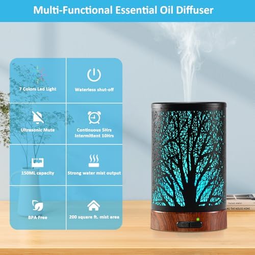 Essential Oil Diffuser - 150ML Metal Aromatherapy Diffuser for Essential Oils with 7 Colors Lights Gifts for Mom Auto Shut-Off & Ultrasonic Cool Mist Diffuser, Ambience for Home