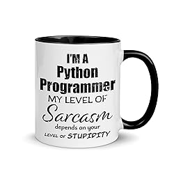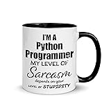 - Looking for the perfect Python Programmer Gifts to impress your friend or family member on their special day? Look no further! Our Black Color Accent Coffee Mug is the ultimate Birthday Gift for the Python Programmer who appreciates a touch of humor and practicality. This 11oz white ceramic mug, featuring a sleek black accent handle and rim, is both microwave and dishwasher safe, ensuring durability and convenience for daily use. The standout feature of this unique coffee mug is the witty quote: I'm Python Programmer My Level of Sarcasm Depends on Your Level of Stupidity. This playful yet bold statement is sure to resonate with any boss who enjoys a bit of sarcasm and isn't afraid to let their personality shine through. Whether you're celebrating a boss's birthday or simply want to give them a fun and functional gift, this mug is an excellent choice. Perfect for morning coffee or afternoon tea, this mug makes an ideal addition to any office or home kitchen. The high-quality ceramic construction ensures it will last for years, making it a thoughtful and lasting Happy Birthday present. With its eye-catching design and practical features, this mug is not just a gift but a daily reminder of your appreciation. So, if you're searching for Python Programmer Gifts that combine humor, practicality, and style, this Black Color Accent Coffee Mug is the perfect solution. Show your boss how much you value them with a gift that brings a smile to their face every time they use it. Make their birthday or any occasion extra special with this unique and memorable gift!