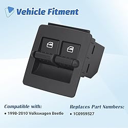 【Compatibility】 The driver side power window switch control button compatible with 98 99 00 01 02 03 04 05 06 07 08 09 10 Volkswagen Beetle 【Replace Part】 This driver side window control switch replace VW vehicle Oem 1C0959527 【Specification】① Terminal Connector: 8 pins; ② Material: ABS plastic; ③ Installation Location: front left driver side; ④ Package Content: 1 x electronic window switch 【Easy Installation】Plug and play style. Just need to remove the defective switch and replace it, easy to install.Please check your original switch thoroughly to ensure you are ordering the correct switch 【Purchase Without Worry】 If the power window switch has any problems, simply contact us for giving you a satisfactory solution