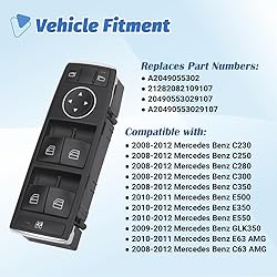 【Compatibility】 The master power window switch driver side compatible with 2008 2009 2010 2011 2012 Mercedes Benz C230 C250 C280 C300 C350 C63 AMG, 2010-2011 E500 E63 AMG, 2010-2012 E350 E550, 2009-2012 GLK350 【Replace Part】 This driver side window control switch replace vehicle Oem A2049055302, A20490553029107, 21282082109107, 20490553029107 【Specification】① Terminal Connector: 3 pins; ② Material: ABS plastic; ③ Installation Location: front left driver side; ④ Package Content: 1 x electronic window switch + 1 x switch removal tool 【Easy Installation】Plug and play style. Just need to remove the defective switch and replace it, easy to install.Please check your original switch thoroughly to ensure you are ordering the correct switch 【Purchase Without Worry】 If the power window switch has any problems, simply contact us for giving you a satisfactory solution
