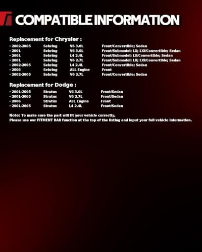 - 【Vehicle Fitment】Torchbeam brake kit fit for 2001-2005 Chrysler Sebring 2.7L, 2001-2005 Dodge Stratus 2.4L, 2006 Chrysler Sebring, 2001-2005 Chrysler Sebring 2.4L, 2006 Dodge Stratus, 2001-2005 Dodge Stratus 2.7L, 2001-2005 Dodge Stratus 3.0L, 2001-2005 Chrysler Sebring 3.0L