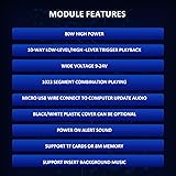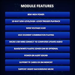 80W Voice Playback Module : The voice module speaker power maximum power is 80W, and the big power output makes the module sound better. This robust performance makes it great in a variety of audio applications, making it useful for applications that require long, wide-distance voice transmission or require big -fidelity voice. Good for Industry Broadcast Device. Support USB Download : CH358D low lever trigger sound chips can be connected to the computer via Micro-USB to copy audio files, enabling the playback of different audio content or safeguarding crucial sound files through backups. Note: The audio file must be in mp3 format, and the file name must be 5 digits: 00001-00010. Module Features : CH358D Low Lever Trigger Sound playback board 1. Support MP3 hardware decoding. 2. Sampling (KHz):8,11.025,12,16,22.05,24,32,44.1,48. 3. Multiple control modes: 10-way button one-to-one, MP3 mode, combined playback.4. With 8MB memory, can be connected to the computer via USB to copy audio files.5. Built-in big-power amplifier with a maximum output of 80W. 6. Supports power on broadcast and background music insertion. 7.Supports 8 playback mode selections, which can be adapted to different applications.8. Dedicated BUSY signal output indication. Support Update Audio】Music player comes with a USB interface, which allows users to use USB cables (included) to connect computers or other devices and transfer audio files to the module's built-in storage. File transfer is more convenient and fast.Note: The audio file must be in mp3 format, and the file name must be 5 digits: 00001-00010. 10 TRIGGER PORTS : Voice device is equipped with 10 trigger ports, by connecting these ports, users can achieve 8 playback mode selections, which can be adapted to different applications., such as single loop, loop playback or snap trigger playback. This makes the voice module very flexible and suitable for application in various scenario. Adjustable Volume : The voice playback module volume decreases clockwise and increases counterclockwise. This feature allows users to adjust the volume according to their needs, while avoiding excessive volume that can have an adverse effect on hearing. Wide Applications : Whether you need long-distance voice transmission or big-fidelity sound, this module delivers robust performance to meet your requirements.Design for industrial voice prompt, workshop operation prompt, boiler liquid temperature monitoring prompt, boiler liquid capacity monitoring prompt, industrial process adjustment analysis prompt, equipment inspection voice prompt, voice horn, mine voice horn, voice alarm, oil field voice horn, car reverse horn, car voice horn, voice prompt, etc.