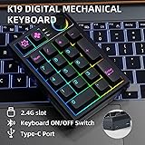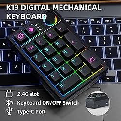 TRIPLE MODE: The K19 wireless numeric keypad is equipped with a triple link mode, wired, Bluetooth or 2.4Ghz wireless connectivity for convenient use. The numeric keypad also features a high-capacity 1500mAh battery to ensure long-lasting use without frequent recharging. Hot Swappable Numeric Keypad: Plug and play.You can customize the key functions and lights according to your own preferences. numpad is full-key hot swappable keyboard allows for freely change the most keyboard switches with 3-pin/5-pin. Multifunction Knob: The K19 Number Pad Keyboard's rotary knob adjusts RGB lighting effects and all media functions, It is easy to adjust the volume and brightness, or you can adjust the knob to your liking for RGB lighting customization. Gasket Bluetooth Numeric Keypad: K19 numeric keypad adopts the gasket type installation structure, the gasket is made of imported PORON foam tape, The tapping sound is pleasant. Ergonomic Numeric Keyboard: K19 wireless numeric keypad is with sloped keyboard and heat-sublimation PBT keycaps, durable, perfect for financial accounting keyboards.compatible with Windows/Mac/Linux/Android/IOS multiple systems.