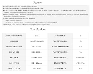 - Overview This is Waveshare 2.13inch E-Paper HAT+ for Raspberry Pi. E-Ink Display 250x122, Immersion Gold Process, SPI Interface, HAT+ Standard, with Pwnagotchi Tutorial Features 1. with Raspberry Pi 40PIN GPIO header, compatible with Raspberry Pi series boards, Jetson Nano 2. Support partial refresh , low power, wide viewing angle, paper-like effect 3. Onboard high-precision R T C chip for accurate time control 4. Optimized PCB layout with additional mounting holes for fixing screws 5. Adopts Immersion Gold process, anti-oxidation and anti-corrosion, enhances soldering performance and improves electrical properties, with better durability and reliability to meet various applications 6. Adopts Raspberry Pi HAT+ standard to improve interoperability, helping the users to design and develop faster, easy to use with other peripherals and extend more functions for Raspberry Pi 7. No backlight, keeps displaying last content for a long time even when power down 8. Thin and light design, Compact in size, more space-saving 9. Comes with Online Development Resources and Manual: bit.ly/4ebAbHN For Example: driver board circuit diagram examples for Raspberry Pi OS / Jetson Nano, etc. and provides pwnagotchi porting tutorial Specifications Operating voltage: 3.3V Grey scale: 2 Interface: 3-wire SPI, 4-wire SPI Display color: black, white Resolution: 250 × 122 pixels Full refresh time: 2s Partial refresh time: 0.3s FAST REFRESH TIME: 1.8s Dot pitch: 0.194 × 0.194mm Refresh power: 10.5mW (typ.) Standby power: <0.01mW(typ.) Viewing angle: >170° Outline dimensions: 65 × 30.5mm Display size: 48.55 × 23.70mm Package Content 2.13inch e-Paper HAT+ x1 Screws pack x1
