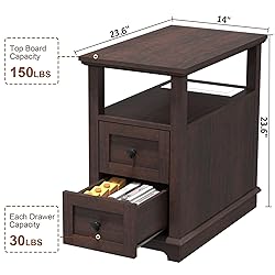 2 Drawers: The open compartment underneath the tabletop and 2 drawers provide ample storage for your space and help to keep clutter organized.HIFYOBRO end table with high quality metal silent slides that open each drawer with a gentle slide, these labor-saving drawers are a great addition to your everyday life. Hidden Quick Charge: The flip-top charging station consists of 2 AC outlets, 1*PD Type-C USB port and 1*USB port for easy charging of electronics. For safety reasons, we have equipped it with a lift function and placed it in a compartment. You don't have to worry about children or pets accidentally touching it while charging; when not in use, it can be turned off by hand pressure. Stable & Durable: This narrow side table is made of quality materials such as laminated wood and solid wood for durability. Its sturdy construction allows the table to hold up to 150 pounds, easily accommodating a variety of items. Multi-scenario application: Semi-open storage space combined with drawer storage, easy to categorize and store items; drawer design can effectively prevent dust from entering. The end table is vintage styled to complement a couch, or chair in a living room, bedroom or narrow space. 2 YEARS SUPPORT: HIFYOBRO narrow end table size: 23.6"(L)*14"(W)*23.6"(H), We pay great attention to product quality and customer service. Any quality problem, please contact us, our friendly customer service team will always be here.