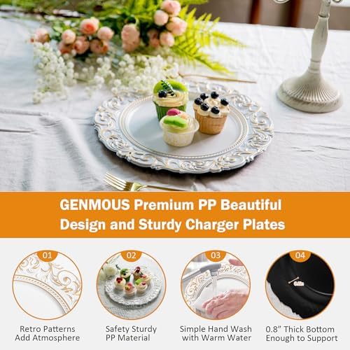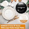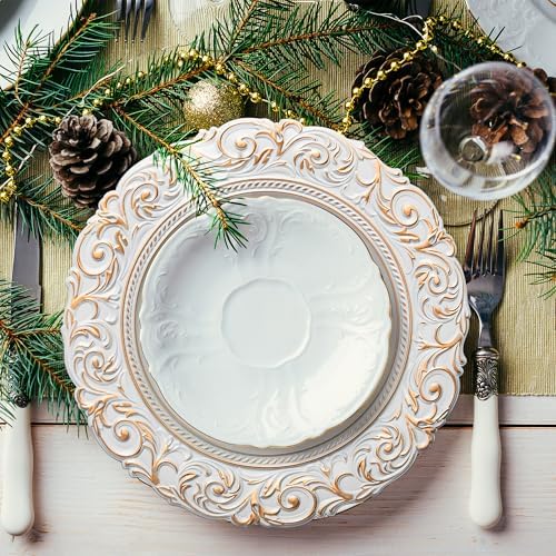 GENMOUS 13" White Charger Plates Set of 6, Vintage Embossed Plastic Table Chargers for Wedding Party Christmas Thanksgiving, Elegant Gold Dinner Plate Chargers Bulk for Rustic Farmhouse Kitchen Decor