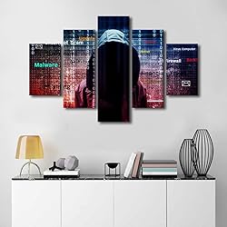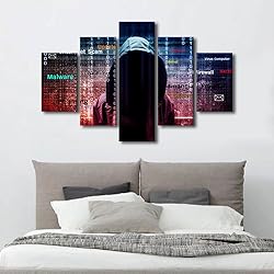 Computer Hacker Wall Painting 5 Pieces Cyber Attack Canvas Wall Art Hacker Network Technology Wall Decoration for Living Room Giclee Wooden Framed Ready to Hang Posters and Prints (60"Wx40"H)