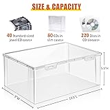 CD Storage Box: Simple plastic box for storage your music CDs, movie discs, audio cassettes, VHS tapes, and more! Large Capacity: CD box Dimensions: 12.5" L x 9" W x 5.5" H. Suitable for 40 standard-sized jewel CD cases, 80 CDs in slim cases, or 220 discs in CD sleeves. High Transparency, Easy to Organize: You can read CD titles from side of the clear CD box. View your CD collection at a glance and quickly identify the CDs stored inside. Water Proof and Dust Proof: Snap-tight latches will prevent dust get in. Protect your CDs in great condition. Perfect for theatre room, living room and play room. Durable Construction: Made of high-quality, durable BPA-free clear plastic. The box designed with reinforced snap to secure lock your precious CD/DVD collections. Stackable Design: Can be stacked to save space. Maximize space efficiency, the box allows you to neatly organize and store your CD collection, freeing up valuable shelf or desk space.