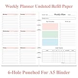 UNDATED WEEKLY PLANNER REFILL - 5.8" x 8.3" weekly planner paper refill, double side colorful. You can start using it at any time without wasting a page. Whether it's 2025, 2026, or beyond, you can seamlessly continue your weekly planning journey without constraints. 53 SHEETS - Planner refills with 53 sheets/106 pages for 1 yearly, improve your productivity with this daily organizer. Easy portability for daily use at work, home, school, or during travel 6-HOLE - Loose leaf weekly paper perfectly fit standar 6-hole inserts, refill paper for A5 binder, SIX (6) ring binders, like Filofax, Kikki k, Carpe Diem (A5), DON'T fit 3/7 ring binders MAKES YOUR LIFE PRODUCTIVE - This weekly planner refill page includes space for weekly focus, 3 top priorities,13 to do list, habit tracker, and habit tracker together for daily affairs. Track healthy habits for each week and use the checkbox as a visual reminder. This to do list planner refill con help you to save time and achieve your goals. HIGH QUALITY - Weekly planner refill is used to high quality 100gsm pure white premium acid-free paper, so you can confidently use most pens, pencils, and markers without ghosting and bleed-through.