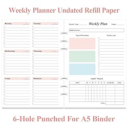 - This undated weekly planner refill size 5.8" x 8.3", double side colorful, You can start using it at any time without wasting a page. Whether it's 2025, 2026, or beyond. Planner refills with 53 sheets/106 pages for your expense tracker, Lasts 1 Year, Undated, improve your productivity with this budget organizer. weekly paper perfectly fit standar 6-hole inserts, refill paper for A5 binder, SIX (6) ring binders, like Filofax, Kikki k, Carpe Diem (A5), DON'T fit 3/7 ring binders. This weekly planner refill page includes space for weekly focus, 3 top priorities,13 to do list, habit tracker, and habit tracker together for daily affairs. Track healthy habits for each week and use the checkbox as a visual reminder. This to do list planner refill con help you to save time and achieve your goals.