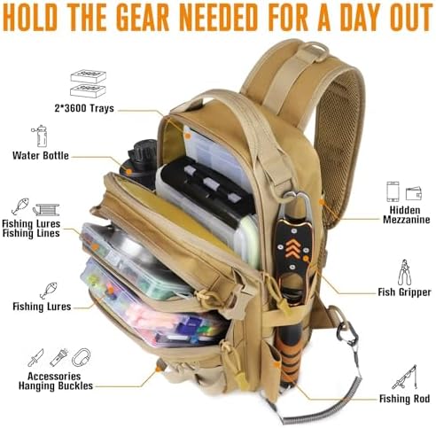 - 【Double Reinforced Fabric】: It is made from high-density nylon. We added two layers of fabric to the zipper area of the backpack to increase the durability of the fishing sling bag, so you don't have to worry about tearing and damaging the fishing bag even when it's heavily loaded. Suitable for a variety of environments. Back is thickly padded mesh fabric to dissipate gravity and relieve pressure. Better breathability and perspiration. It's comfortable enough for a day of bank fishing.