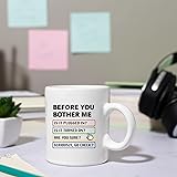 Hilarious Reminder Mug: Get straight to the point with our "Before You Bother Me" mug, designed especially for those who love coding and appreciate a little peace and quiet. This ceramic mug features the humorous and relatable message, "Before You Bother Me," making it clear that your time is valuable. Perfect for your favorite hot or cold beverage, this mug is a great addition to any programmer's desk and a fantastic gift for colleagues, friends, or family members in the tech industry. Premium Ceramic Coffee Mug: This high-quality 11oz ceramic white mug has a premium hard coat that provides crisp and vibrant color reproduction sure to last for years. Printed on both sides for either left or right-handed person so the awesome message and art will be visible. High-gloss and has a premium white finish that can make you enjoy your drink more. Can also be used as pen holders on your office work table, planter for your kitchen herb, jewelry holder, or serving your favorite dessert. Relatable Humorous Quote: Put a smile on your love ones’ faces with this mug with a funny quote. This drinking mug has a humorous relatable saying that can make any person smile when they read this. A stressful or hard day can also be fun with this drinkware on their dining, kitchen, or work table. A perfect conversation starter, and sure to amuse anyone. Funny Gift: Best funny gift for geeks and nerds during birthdays, Valentine’s, retirement, holidays, wedding anniversaries, Christmas, work events, or any special milestone that occurs in life. Great item for your loved ones who can relate to this loving message and make them laugh every time they use it. Dishwasher and Microwave Safe: These fantastic drinking mugs can go straight in the dishwasher, all day every day, meaning it can save you time, and be more hygienic. Perfect for your favorite hot or cold beverages. Easily reheat that coffee or tea you forgot to drink right away because it is microwave safe. Saves you time, is very convenient, and is perfect for your busy lifestyle.