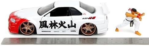 Jada Street Fighter 2002 Nissan Skyline GTR with Ryu Figure – 1:24 Scale Die-Cast, Opening Doors, Hood, Trunk, Rubber Tires – Collectible for Adults and Kids – Capcom Licensed