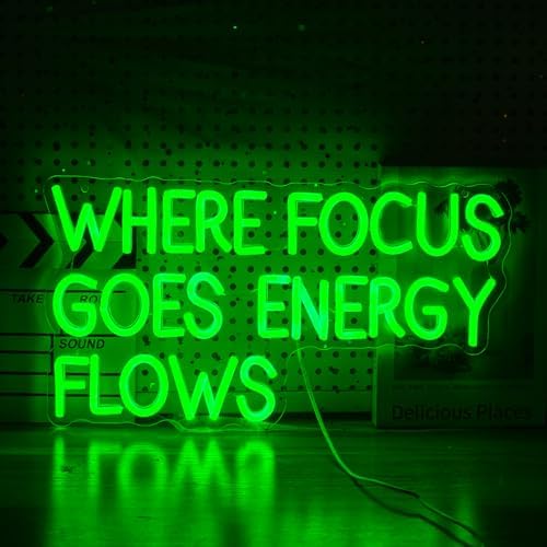 Where Focus Goes Energy Flows Neon Sign 16.5 * 9.1In Dimmable Green Postive Quotes Light Up Sign for Wall Decor Led Words Neon Light for Bedroom Party Bar Personzalized Gift (USB Powered)