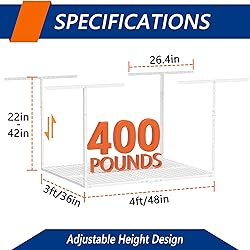 Space-saving: Meet your storage needs with a ceiling mounted garage storage system for storing unused items. This hanging storage system is a great place saver, providing you with better storage place and better organization. HIGH QUALITY: Garage ceiling storage racks can load 400 pounds and are perfect for storing bikes, lockers, sports devices, holiday items. The powder-coated finish is durable, scratch-resistant, waterproof, and rust-resistant. ADJUSTABLE HEIGHT: Our garage storage racks are height adjustable, giving you the freedom to adjust the distance between the rack and the ceiling from 22 inches to 42 inches. This 3 x 4 FT ceiling mount rack increase 40 cubic feet of storage place. DIY INSTALLATION: Refer to the instructions, install it step by step first, then adjust the direction and height freely according to the place characteristics of your house. CUSTOMER SUPPORT: We provide the best solution within 24 hours. Please feel free to contact us.