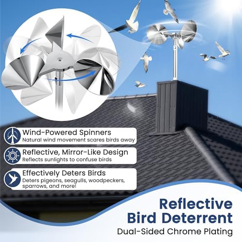 - [Long Lasting Weather Resistance]: Crafted from quality outdoor grade aluminum and weatherproof plastic, this bird reflector deterrent is resilient against harsh conditions to withstand extended outdoor use. This bird deterrent rotates without noise. Rain or shine, bird repellent remains sturdy and effective, ensuring lasting bird control where you need it regardless of the weather