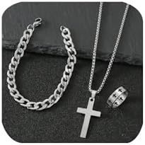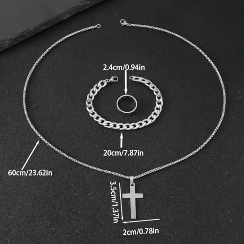 3 Pcs Man's Stainless Steel Cross Necklace Bracelet Ring Set Silver/Black Christian Gift Figaro Chain Necklace Crucifix Cross Pendant Cuban Chain Bracelet Hollow Cross Ring(silver)