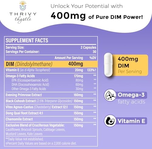 - Customized DIM for Women: Achieve balance with Thrivy Thystle DIM supplements. This powerful formula supports clear skin, promotes a healthy internal barrier, and helps alleviate common discomforts like temperature changes and mood variations