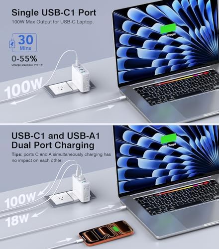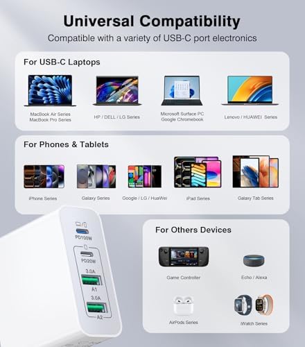 - 【Efficient Charging & Wide Compatibility】This 4 Port GaN III charger is able to charge 1 laptops and 3 smartphones/tablets at the same time. It’s compatible for MacBook Pro/Air, iPhone 17 16 15 14 13 12, iPad Pro/Air, Galaxy S10 or previous models, Google Pixel, Dell XPS, Switch, and more