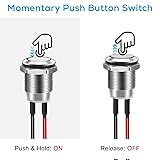 Specifications: DC 12V / 2A, 12mm (1/2") metal momentary push button switch without LED (10 PCS) Easy to Use: Momentary operation type-press and hold the button to keep it ON, release the button to turn it OFF Durable & Waterproof: 12V pushbutton switch is made of high-quality stainless steel, durable and anti-rust. IP65 waterproof rating allows use in wet or dusty environments Installation Note: The mounting hole diameter is 12mm (1/2"). Please verify the size before purchase Wide Compatibility: This 12V push button switch is perfect for automotive, race cars, RVs, marine applications, heavy-duty trucks, off-road vehicles, ATVs, and any 12V power system