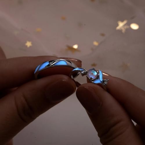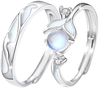 Glowing Band Moonstone Silver Couple Matching Promise Rings for Couples, Women, Men, Him, Her Set of 2 - Adjustable, Gift Wrap