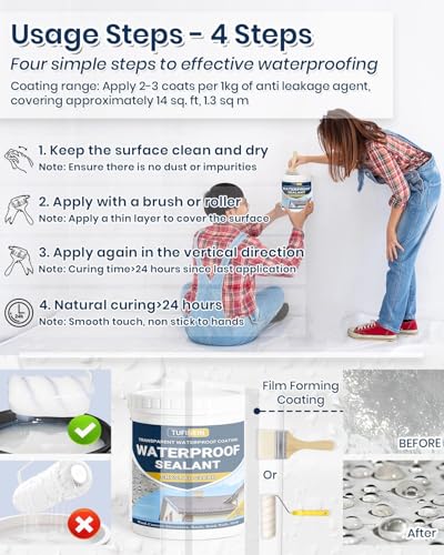 - Highly Effective Waterproofing and Anti-Leakage: Clear waterproof sealant is a water-based coating, waterproof coating cures to form a dense waterproof membrane that effectively insulates against air, water and moisture. The waterproof coating becomes more stable over time
