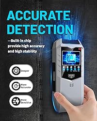 【Accuracy and High Stability Stud Finder】This stud finder wall scanner features a precision-engineered chip for fast, accurate detection of metal, studs, joists, pipes and live AC wires behind walls, floors and ceilings. 【Rapid Stud Finder Wall Scanner】Upgraded Smart Sensor Stud Finder enhances detection speed for quick and effortless use, ideal for professionals, homeowners, and DIY enthusiasts alike. 【5 in 1 Multifunction Detection】With Multiple Detection Modes, our upgraded stud finder adapts to your specific needs and projects with 5 scanning modes. Includes 1/2 inch scan mode (up to 1/2 inch deep), medium scan (up to 1 inch deep), deep scan (up to 1.5 inches deep for wood and metal studs), metal scan (detects metal up to 2.36 inches deep), and AC scan (detects live unshielded AC wires up to 2 inches deep). 【Digital LCD Display & Audio Alarm】The stud finder provides upgraded backlight LCD display so it is clearly and accurately to read and detect the exact location of the objects even in low-light conditions. When finding the objects, the LCD display will indicate the direction and the intensity of beep alarm to tell whether you are more close on the edge or center of the target, ensuring precise detection every time. 【Easy to Use and Reliable】The stud finder is One-Button designed for easily using. Its implifies operation with a single button that serves as both the power switch and mode selector. Its precise detection capabilities help pinpoint stud locations accurately, facilitating the installation of items like TVs, cabinets, and garage shelves in your home. 【Easy Calibrate】To ensure perfect accuracy, please calibrate before each use or after prolonged periods away from testing environments. Press the Scan button to initiate calibration; once completed, indicated by a single beep and disappearance of decreasing bars, keep the tool flat against the wall. Avoid rocking, tilting, or applying excessive pressure while slowly sliding it across the scanned surface. The stud finder will emit a beep upon detecting the stud edge. 【Multi-purpose Use】This stud detector wall scanner swiftly locates hidden wood, metal, and AC wires within house walls, floors, and ceilings, ensuring safety during installations of TV mounts, photo frames, wall cabinets, garage racks, shelves, mirrors, bathroom fixtures, and other decorations. Ideal for Christmas Day and Halloween Decorations, birthdays for men, husbands and boyfriends.
