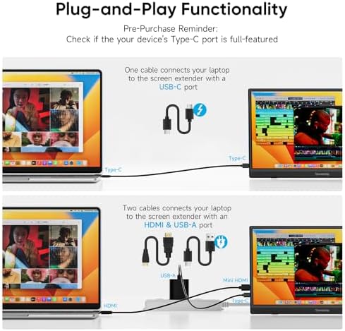 - 【Plug and Play Right Out of the Box】No complicated setup needed! This portable laptop monitor instantly connects as a second screen—plug it in and start using it. It works with most modern laptops via USB-C, so you’ll be ready to go in seconds. Note: Some laptops and phones without full-featured USB-C ports might need an extra USB-A to USB-C cable for power.