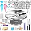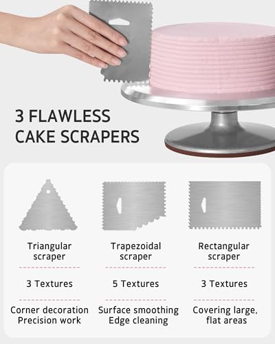 What's in the box: Aluminum alloy cake turntable *1 Russian couplers * 2 Icing couplers * 3 Cleaning brush *1 Flower nail *1 Flower lifter *1 Cake server *1 Straight spatula *1 Angled spatula *1 Cake knife *1 Cake leveler *1 TPU piping bag *1 Icing comb *1 Plastic icing scraper *1 Silicone ring *2 Stainless scraper *3 Cupcake liner *80 Disposable piping bag *100 Piping tips * 51 All-in-One Cake Decorating Supplies: 1. Nice for the starter to use and enough for the professionals. 2. Basic baking accessories are completely included in this set: 3 steel scrapers - Each one has a variety of patterns to choose from, such as straight edge, wavy edge, serrated edge, and curved edge, each serving a different decorative purpose. Flower nail & lifter set - Use the nail to create an exquisite flower and use the lifter to remove the flower to the cake for decorating. The adjustable height icing comb can smooth the cake according to the height of the cake, it is very easy for beginners to smooth the cake.
