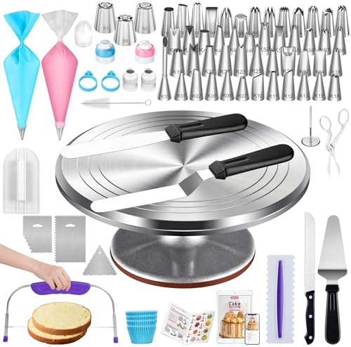 - Complete Cake Decorating Kit - This 253-piece baking supplies has everything the cake beginner or pros use including an 12-inch aluminum alloy cake turntable, 48 numbered piping tips, 3 Russian nozzles, 1 pastry bag & 100 disposable piping bags, 2 bag ties, straight & angled icing spatula, cake knife, cake server, 4 cake icing comb scraper, icing smoother, cake leveler, 5 different size couplers, 80 cupcake liners, flower nail & lifter, cleaning brush.
