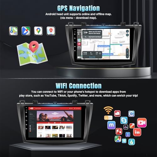 - 【In-dash GPS Navigation & WiFi Connection】This android head unit for 2013 mazda 3 radio replacement comes with a GPS module, once connected to wifi or your phone's hotspot,you can download offline maps or use online maps at any time(via menu - download map). And you can also download many other apps in the app store of car stereo like youtube, Spotify, Youtube, BBC Sounds, WhatsApp, etc., as the same as a big smart phone.