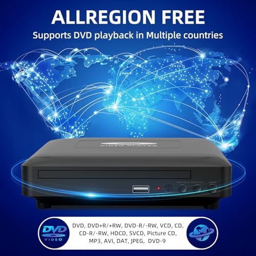 - 【All Region Free DVD Player】This DVD player is compatible with DVDs from all regions (1-6, except for Japan CPRM Discs) and supports disc formats such as DVD, DVD+R/+RW, DVD-R/-RW, VCD, CD, CD-R/-RW, HDCD, SVCD, Picture CD, MP3, AVI, DAT, JPEG, DVD-9. You have the freedom to choose any disc without limitations, no need to worry about disc format issues.