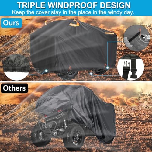 - 【All-weather Outdoor Protection】 The ATV covers waterproof outdoor heavy duty is using for all seasons, protects your vehicle from fading, aging and damage, prevents the dirt, UV, sunlight, rain, snow, dust, falling leaves and bird poop.
