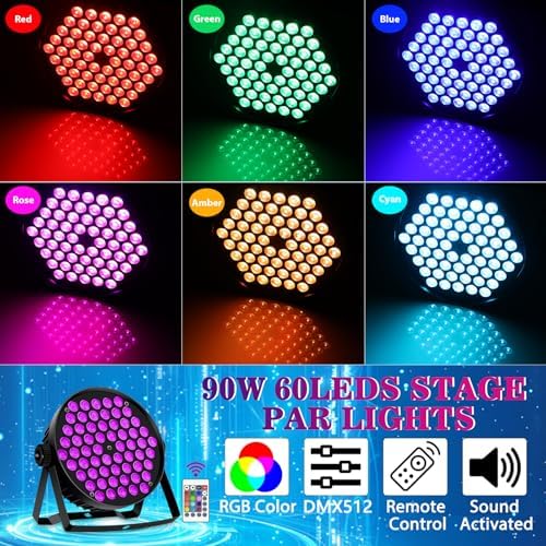 Stage Par Lights,90W 60 LED RGB Stage Par Light DJ Can Lights Sound Activated Auto Play by Remote&DMX Control DJ Stage Party Lighting for Events Wedding Church Party DJ Live Show 4Pack