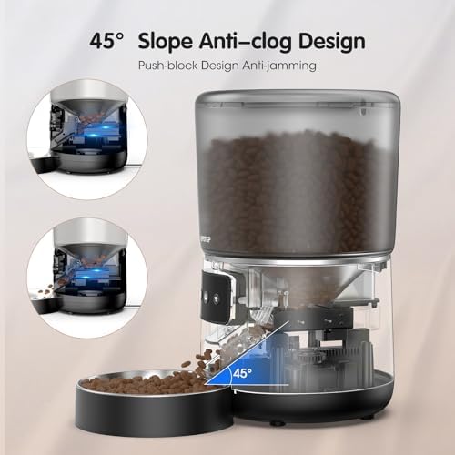 • Anti-Clog Technology: This automatic cat feeder has anti-clog feature, with a 45-degree incline, accelerates the descent of pet food, ensuring a seamless flow. This design effectively prevents clogging, delivering a reliable feeding solution for kibble sizes between 0.07 and 0.4 inches.